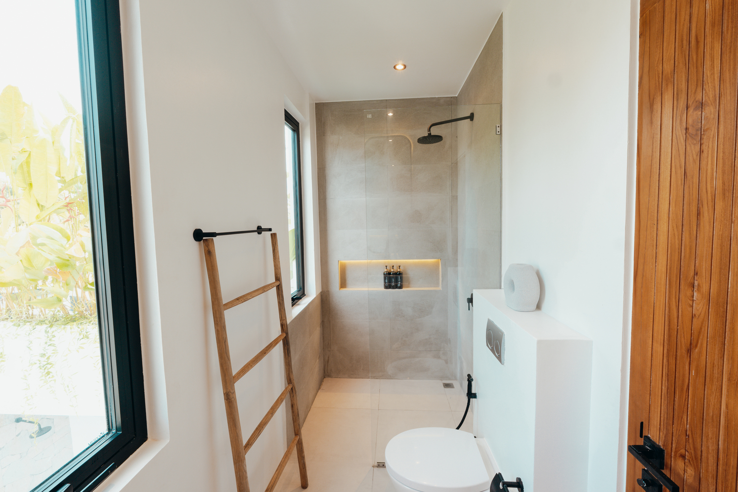 Each of the three bedrooms comes with its own ensuite bathroom, designed with a clean and modern aesthetic to ensure comfort and privacy. The master bedroom overlooks the pool area, providing a tranquil retreat within the villa.